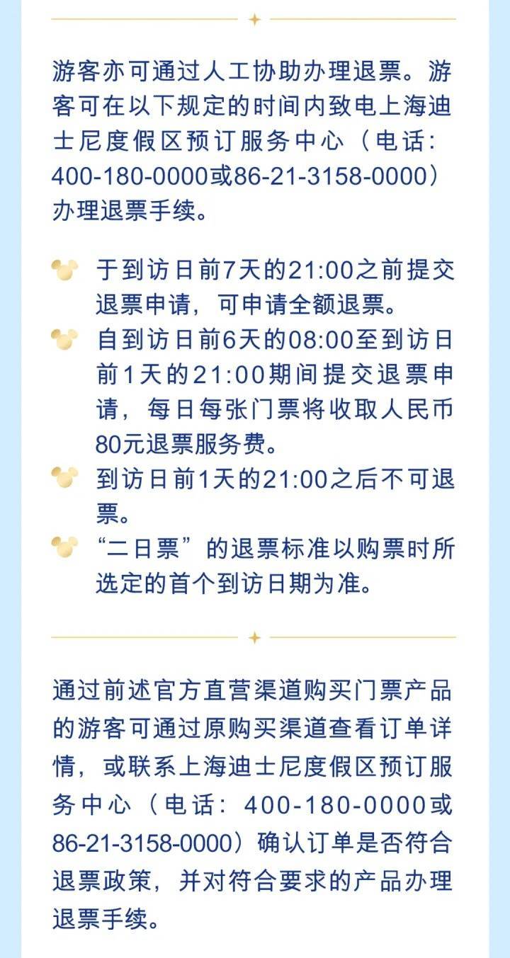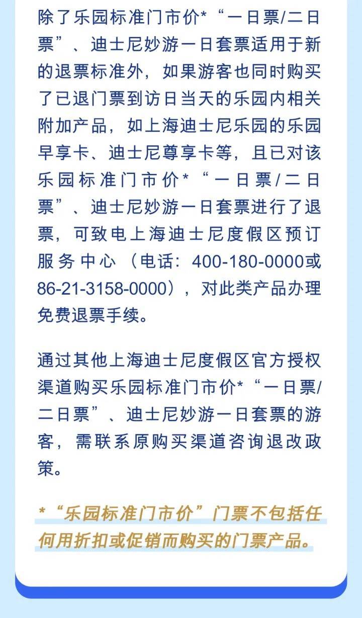 新退票标准为通过前述官方直营渠道购买乐园标准门市价“一日票/二日票”、迪士尼妙游一日套票的游客,于到访日前7天的23:59(含)之前提交退票申请,可申请全额退票;