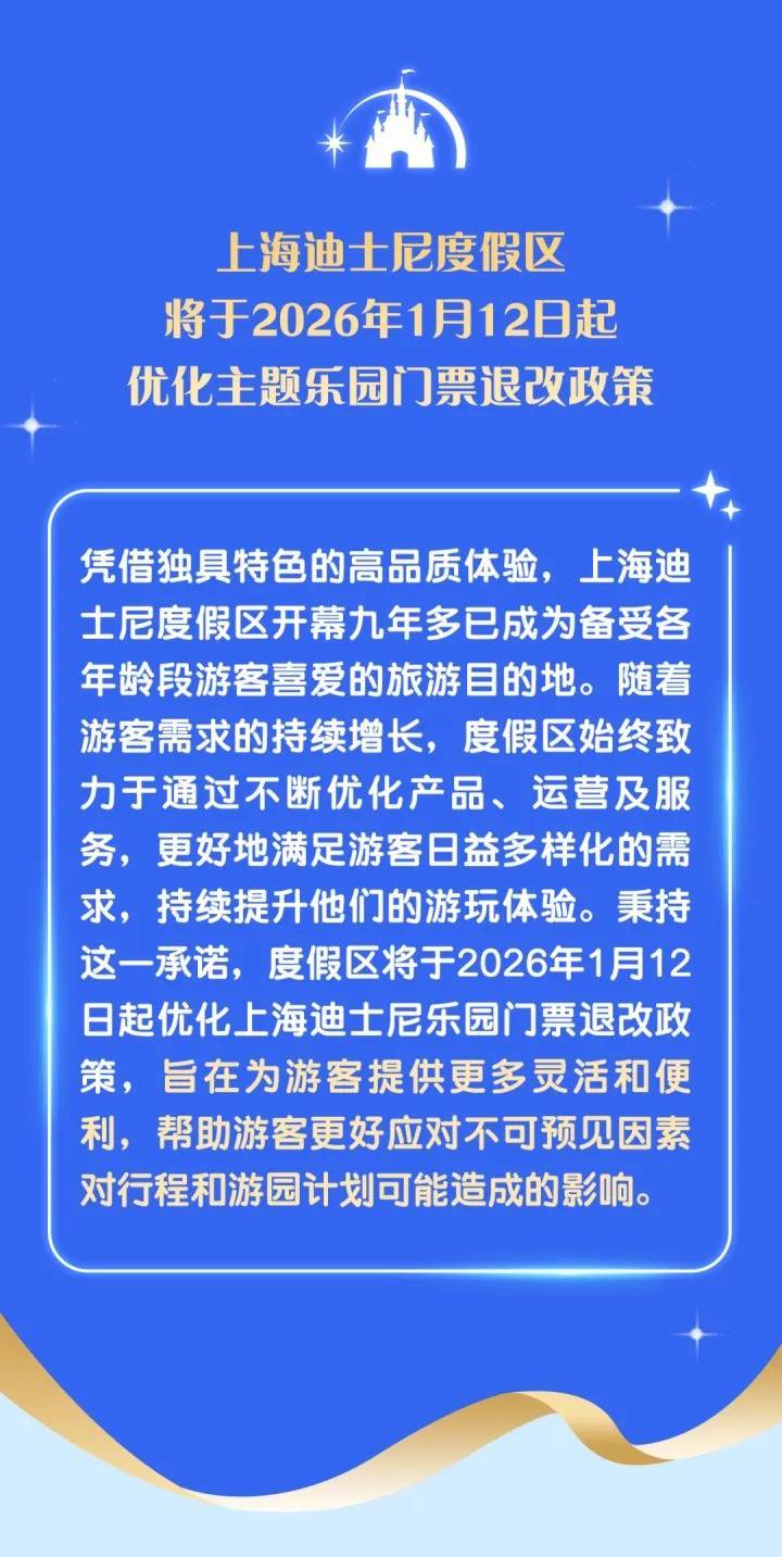 现行的上海迪士尼乐园门票退改政策规定,乐园门票不可转让、取消或退票。在同产品的其他适用日期尚有余票的情况下,游客可于原定入园日零点的48小时前,至多进行两次改期。自2026年1月12日起,上海迪士尼度假区将优化主题乐园门票退改政策。根据新的退改政策,主题乐园门票将实行阶梯式退票标准。